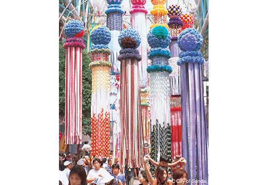 Sendai Tanabata Festival is a special feature of summer woven together by the wind and Japanese paper strips decorating bamboo trees. More than 3,000 ornaments on bamboo trees with unique features such as fukinagashi paper streamers and hanging items form arches throughout the city. You will be amazed at how gorgeous these ornaments are, but the fukinagashi streamers decorating each district showing off the spirit of local residents are also a must-see. The Sendai Tanabata Festival Plaza is set up at the Sendai Citizens Square where you can enjoy spectacular stage performances and events. The Sendai Tanabata Fireworks Festival is held on the eve of Tanabata (August 6), when about 16,000 fireworks are launched every year.