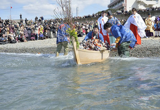Hina nagashi, the ritual floating of dolls down to the sea, takes hina dolls dedicated from across Japan, they are placed on three plain wooden boats with wishes written on them, and then releases them into the ocean. This event, which prays for protection from bad luck and calamities in this world, is an ancient ritual held at the beginning of March. It is said that the event comes from this belief, and is linked to the Awashima faith that all nagashi bina dolls flowed to Awashima-jinja Shrine in Kada, which became popular in the Edo period.