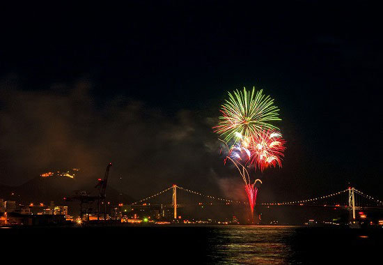 The fireworks display attracts more than 1 million spectators, and offers beautiful contrasts with the fireworks launched from the opposite shore, along with the night view of the Kanmon Straits.