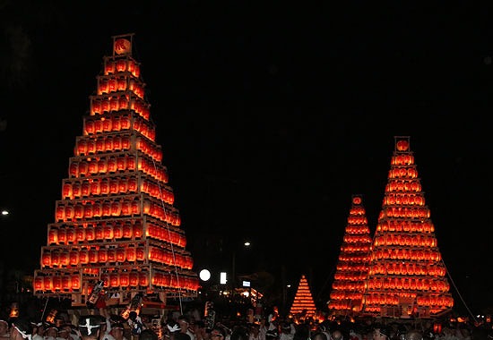 The chochin oyamagasa pyramids are about 10 m high, weigh 2.5 tons, and are courageously carried by around 80 people each keeping in step with the beat of the gongs and taiko drums of the hayashi musical accompaniment.