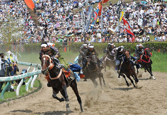 1千年以上もの歴史を誇る相馬野馬追は、国の重要無形民俗文化財に指定されている伝統馬事文化行事です。1日目の出陣式、2日目には騎馬行列と甲冑競馬、神旗争奪戦が勇壮に行われます。3日目には野馬追の起源ともいわれる荒駒を素手で捕らえ神前に奉納する野馬懸という神事が行われます。