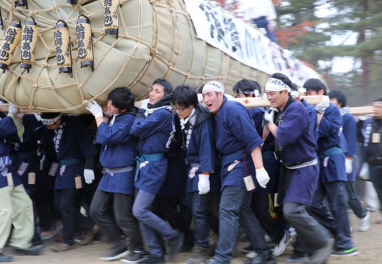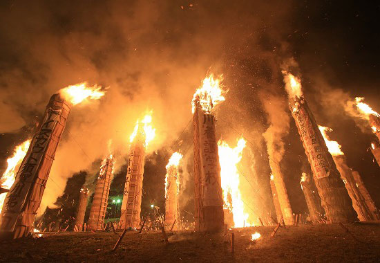 430年以上の伝統を誇る須賀川の秋の風物詩。伊達政宗率いる軍が須賀川城を攻め落とした合戦で、命を落とした多くの人々の霊を弔うために始められたとされています。重さ3トン、高さ10メートルの大松明をはじめ、約30本もの松明が五老山に立てられ火がつけられます。松明太鼓の演奏を背に燃え盛る松明の光景は、まさに戦国絵巻そのものです。