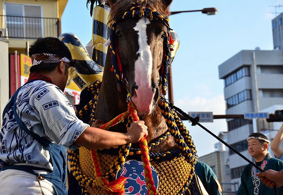 一千年以上の歴史をもち、昔より肥後国随一の大祭と称され、「放生会(ほうじょうえ)」「随兵(ずいびょう)」などと呼ばれ親しまれています。宮遷式で幕を開け様々な奉納行事が行われた後、祭りのハイライト神幸式を迎えます。早朝から神幸行列が始まり、御神輿を先頭に、鎧兜の随兵、甲冑武者、町鉾、獅子舞が続き、壮観な一大絵巻を展開します。その後飾馬と馬追いの勢子が続き、肥後っ子の心意気で威勢良くクライマックスに達します。