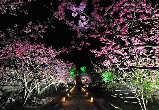 「今帰仁グスク桜まつり」は、桜の開花時期に行われ、幻想的な光で城壁を照らし出し、夜桜を楽しむことができます。