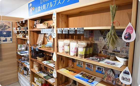 姉妹都市・東京都立川市のLULU Terrace「のーかるバザール」内には、長野県大町市のお米・りんごといった旬の農産物をはじめ、そば・銘菓・ジャムなどの特産品が並びます。三蔵の地酒やクラフトビールなどの取り扱いもあります。大町市内事業者による立会販売、観光パンフレット・デジタルサイネージでの情報発信も。